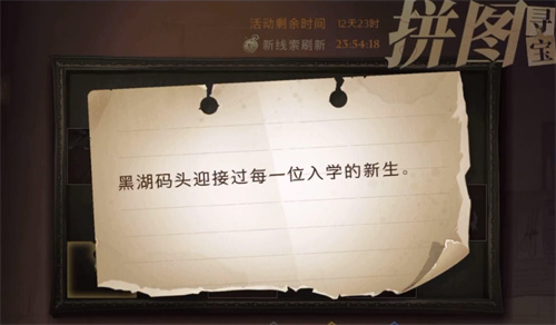 综上所述,线索“黑湖码头迎接过每一位入学的新生”对应的地方就是【黑湖码头】,玩家在码头钟楼正门的半空中找到黄色光球,点击即可获得本线索所对应的拼图碎片!