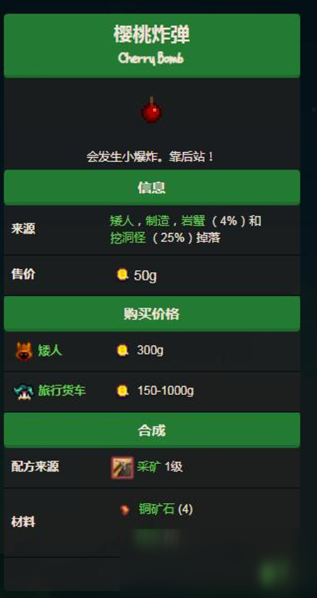 以上就是星露谷物语中樱桃炸弹的获得方法了,我们可以使用4个铜矿石+1个煤炭制作出樱桃炸弹。