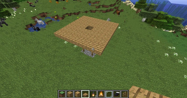 1、首先我们在地上打一个3×3的地基然后用圆石铺置,在四个角上面放置四格栅栏栏杆,中间空着,上面放置3×3的橡木板子。