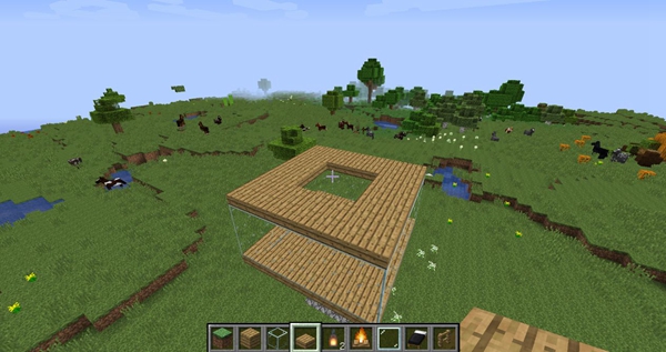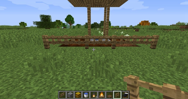 2、然后我们在周围铺上橡木栅栏把小屋围起来。