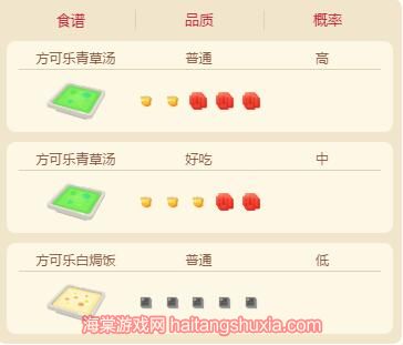 方可乐白焗饭需要放入足量的灰色材料,它将吸引灰色类宝可梦,可能吸引到超音蝠、走路草、小拳石、小磁怪等。从方可乐海鲜锅开始,复合型口味的魅力开始呈现,放入足量柔软的东西和蓝色材料,可以吸引水属性宝可梦,可能吸引到可达鸭、玛瑙水母、海星星、小海狮、鲤鱼王等。