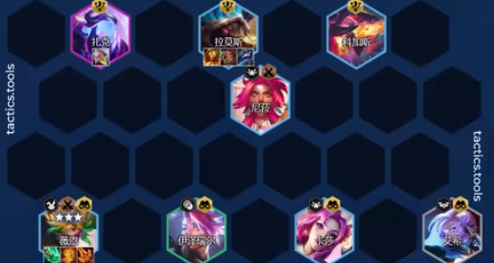 1、棋子组成:薇恩、卡莎、艾希、ez、尼菈、扎克、龙龟、大虫子。