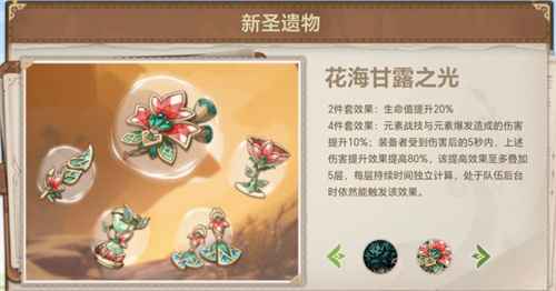正如该套圣遗物的名字那样,【花海甘露之光】—— 又名花神套,2件套的生命值提升与套装的受伤叠加元素战技与元素爆发伤害的buff,恰好贴合妮露的角色特性,