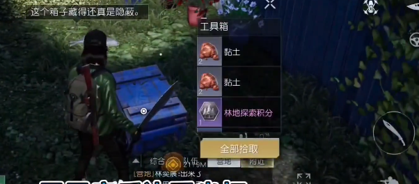《黎明觉醒》红木林地宝箱一个有一个工具箱、五个军械箱、四个医疗箱。工具箱奖励是强力胶𘛞/基础材料礼包𘛝/林地探索积分𘛝子弹壳󴓀/林地探索积分𘛝/银币�/小袋银币𘛞,位置在一个纸箱的附近,靠近墙壁。