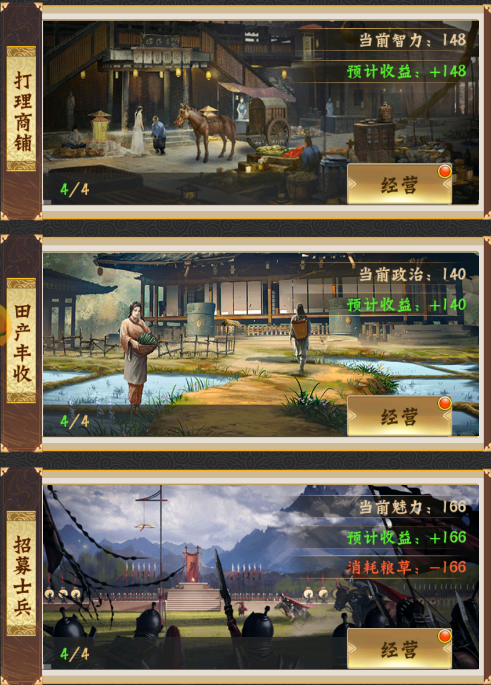 游戏属性为武力、智力、政治、魅力,四项属性的综合加起来就是玩家的势力值,这些属性主要通过强化门客来增加,智力影响每次经营收到的钱财数额,政治影响收到的粮食,魅力影响招兵人数,武力影响你过关卡以及论战以及打副本的数值。