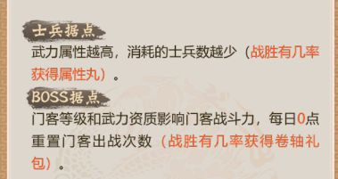 资质提升会大量增加对应属性的数值,所以到后期这才是提升势力最快的途径之一,当然也是最贵的。这里的建议是强化卷轴用在高属性门客身上,如果没有得到高属性门客最好先存着不要用,因为无氪的话强化卷轴是很稀有的。特别是武力卷轴,建议最好针对一位高属性门客强化,四星性价比相对最高,五星六星失败率高了不划算,还不如用书籍经验一步步堆上去。