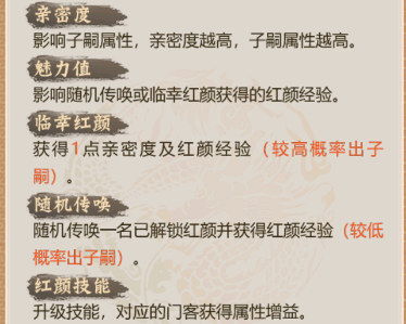 红颜娶回家之后,就可以通过宠幸或者随机传召进行造人活动,前者由你自己选择宠幸哪位老婆,但是要花费元宝每次增加1亲密度,后者随机选人不加亲密度。老婆们对你的亲密度会直接影响孩子的资质,同时老婆的好感还会解锁她的技能。每位红颜解锁技能后会对系统设定好的一位门客进行属性加成,所以升级你老婆的技能也是增加势力值的途径之一。