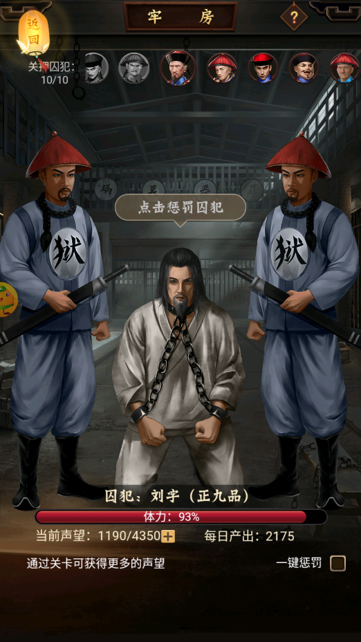 抓获的犯人可以在牢房中进行惩罚,每次耗费10声望,可以获得粮食、金钱、各种丹药、加好感和颜值的道具、元宝、强化卷轴等等。每个犯人被惩罚后扣除的血量不一样,每打光一个犯人的血量才能继续惩罚下一个。而且每个犯人掉落的物品也不一样,越排在后面的犯人掉落的东西越好。声望会在每天凌晨根据你自己的每日产出量(也跟通关数有关)增加,当天剩下也会保留,除非达到上限。