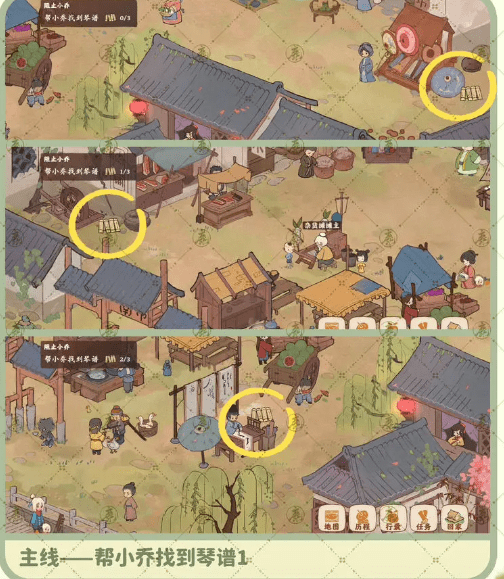 3、主线任务3:帮助小乔找到琴谱1,我们来到集市的如图所示三个地方可以找到。