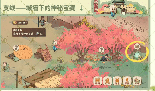 7、支线任务2:城墙下的神秘宝藏,来到城墙下方,如图所示的位置桃花树右边可以找到宝藏。
