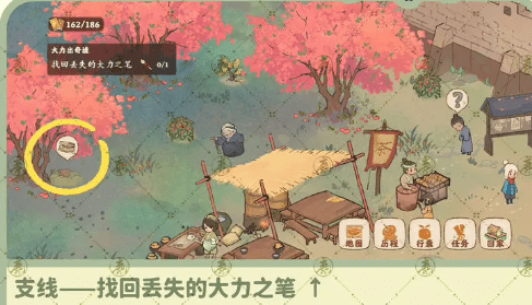 6、支线任务1:找回丢失的大力之笔,来到集市中,在上方左边的桃花树下就可以找到。