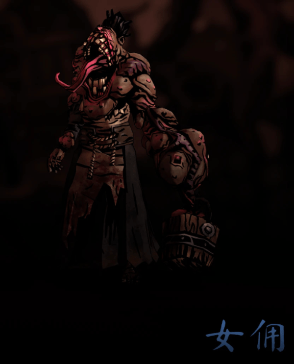 女士下方有一张巨大的,用来吞噬队友尸体的嘴。作为贵族单位,她有权利直接享受牲口与黑山羊的肉,或者吞噬队友的尸体。