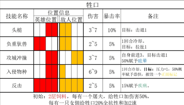 农场对于牲口的利用率非常高,除了取食它们的肉,还将其作为主要的进攻单位。牲口的伤害本身不低,还能利用位移技能来打乱我方队伍。牲口在一号位和3/4号位时,威胁相对较大。