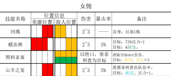 女佣为数不多的技能中,有两个是专门针对牲口的,如果队伍中没有牲口,她们只会在后排复读蠕虫粥,或者在前排使用回溅,回退回后排。