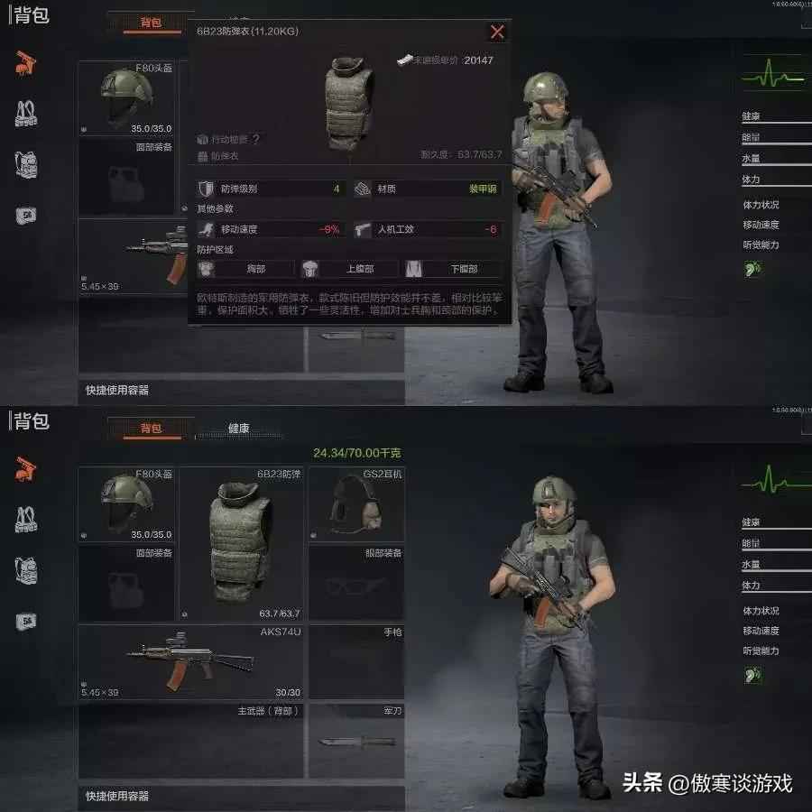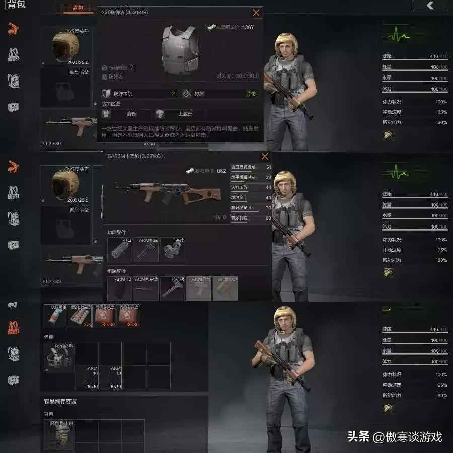 让我来给各位先锋讲讲。一套最经济实惠的基础装如下:1-2级的防弹衣+头盔、一把用的顺手的无改装基础武器(根据个人喜好选择)+低级弹药、轻型登山包&轻型胸挂、绷带+消炎止痛药+简易医疗包。有了这套基础装,你就可以比较轻松对付地图中的游荡者(AI),从而开始物资和柯恩币的积累。