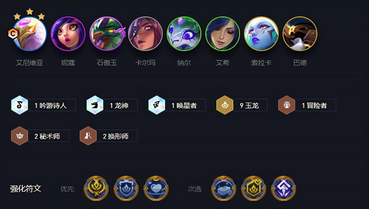 1:阵容由,冰鸟,妮蔻,石傲玉,卡尔玛,纳尔,艾希,索拉卡,巴德组成;