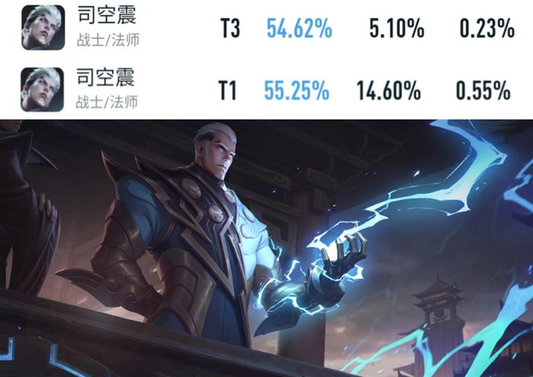 受益于上个赛季的电刀加强,司空震在当前版本中依旧强势,电刀+圣剑完美适配该英雄。目前,司空震的排位胜率高达54.62%,排名位于全英雄第五,巅峰赛胜率高达55.25%,排名位于全英雄第三。