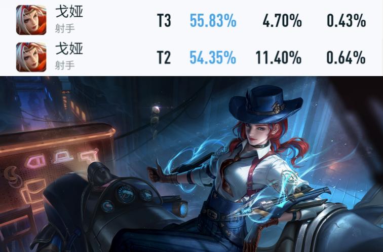 戈娅自从手感被优化之后,其英雄强度大幅提升,该英雄不仅拥有高生存的普攻机制,而且后期伤害也很足。目前排位胜率大涨至55.83%,排名位于全英雄第二,巅峰赛胜率大涨至54.35%,排名位于全英雄第四。