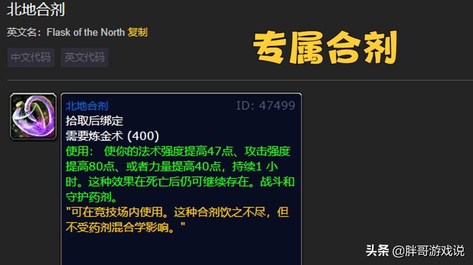 北地合剂是炼金术的专属药剂,可以增加47点法术强度、80点攻击强度或40点力量,持续1小时。北地合剂并不是消耗品,而是可以无限使用的,并且还能在竞技场中使用。
