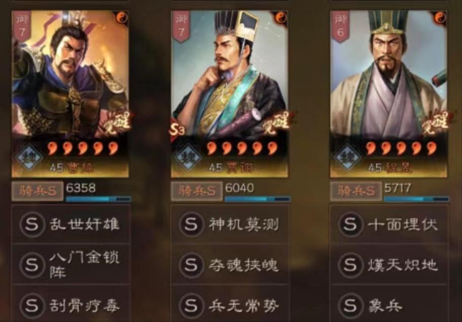 这队魏法骑依旧是由曹操、贾诩、程昱组成的。但是仔细来看会发现所携带的战法是完全异同的,普通魏法骑曹操所携带的是刮骨和军民减伤恢复一手抓,保证队伍的续航能力,但是战法是非常的豪华,今天这队曹操携带的是八门金锁虽然没有那么强的减伤,不过也大差不差。贾诩的战法携带建议携带夺魂和兵无,如果由有伪书就更好毕竟加强的战法。程昱战法携带则抛弃了太平道法,毕竟用了太平和不用太平异同不大,换上了象兵来保证续航,队伍整体注重续航多穿能力。