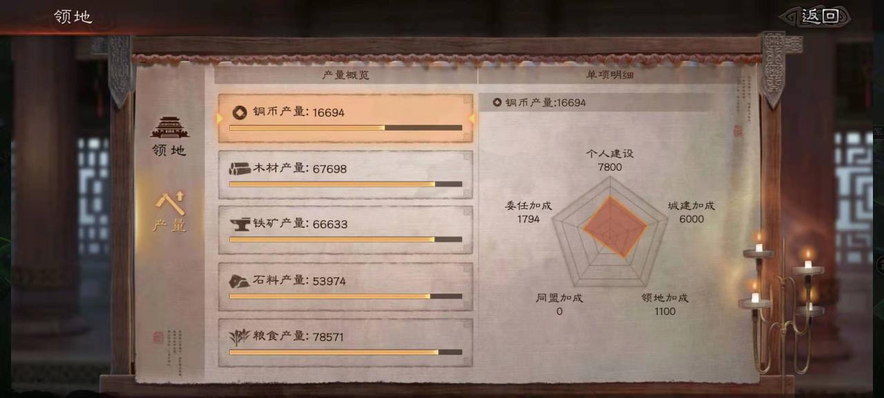 但即便如此铜币产量还是在16000/小时以上,其中产量的占比最大分别是个人建设和城建加成。
