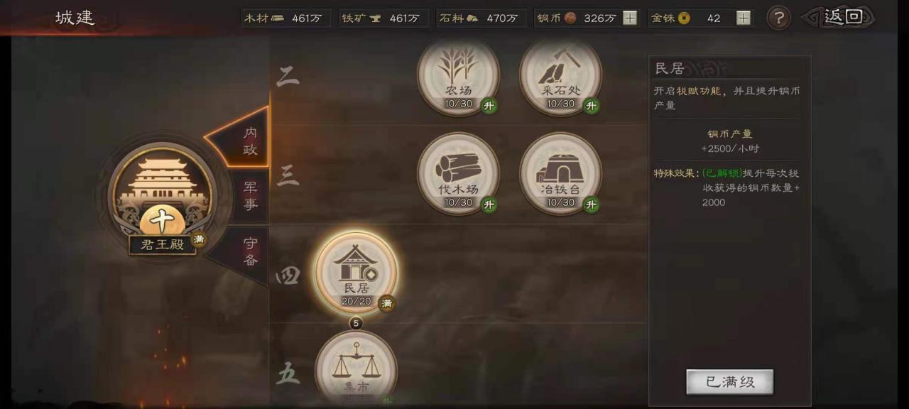 民居满级后2500/小时的铜币产量,主城分城都满级是5000/小时。