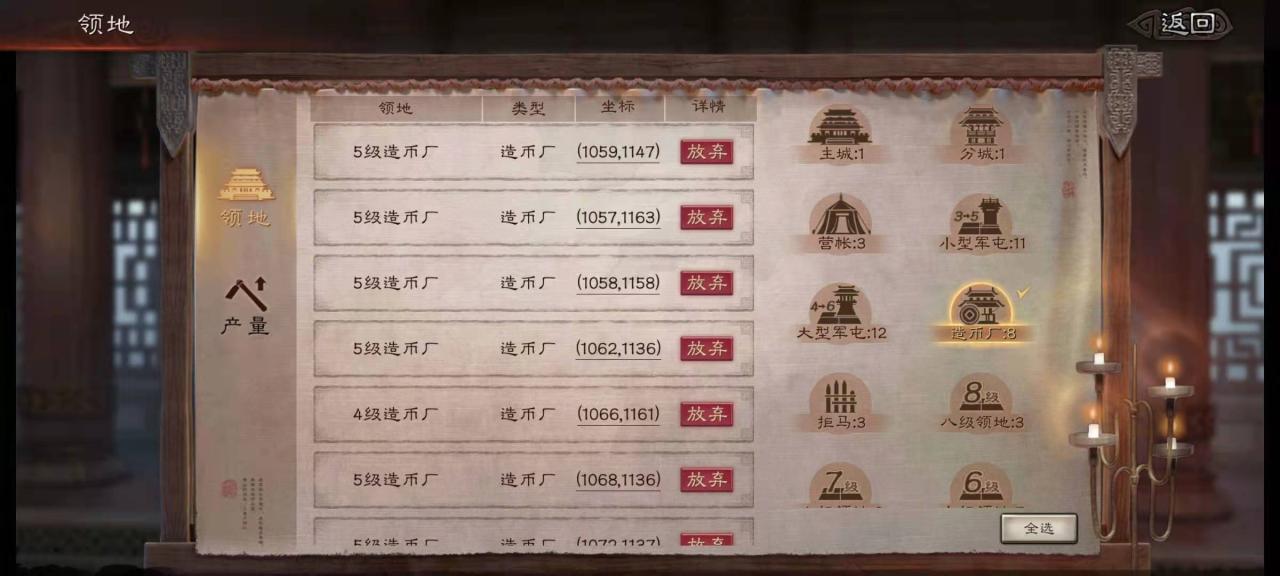 铜币的总产量取决于4个加成,委任+个人+城建+领地。