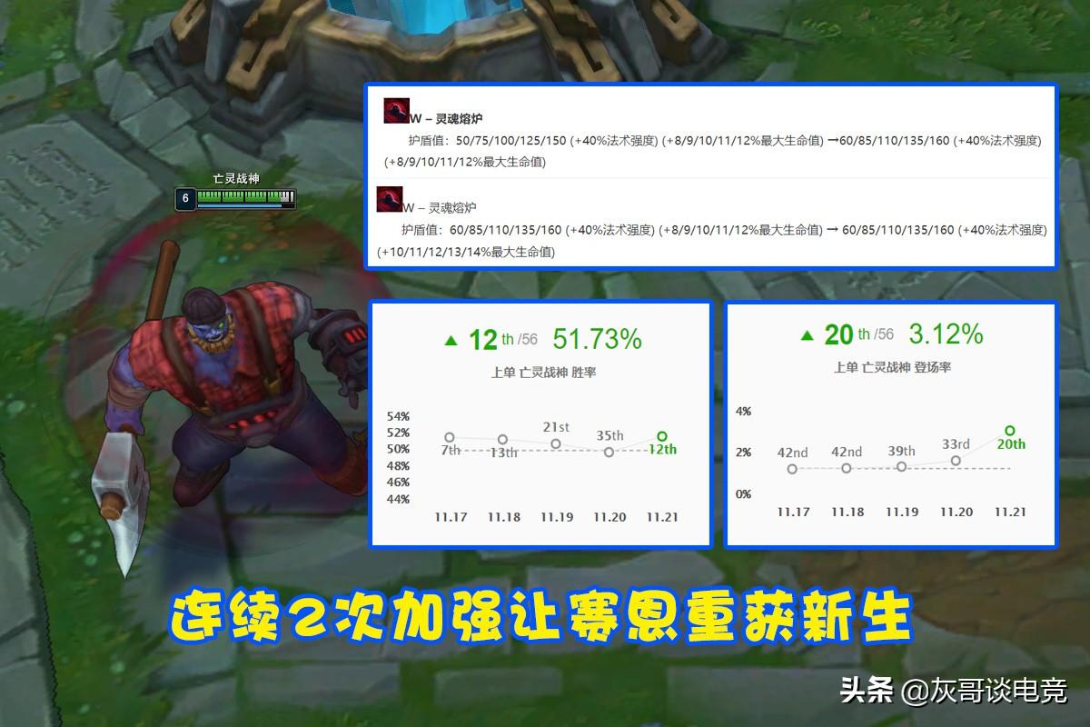 就在近期,灰哥又发现了一个成功转型的坦克英雄,它就是亡灵战神赛恩,W技能护盾步骤了11.19和11.21两个版本的加强之后,赛恩的在上路的地位迎来飙升,胜率与登场率分别比上个版本提升了23、13位,强度排名也从之前的T4、T5徘徊晋升至T2。