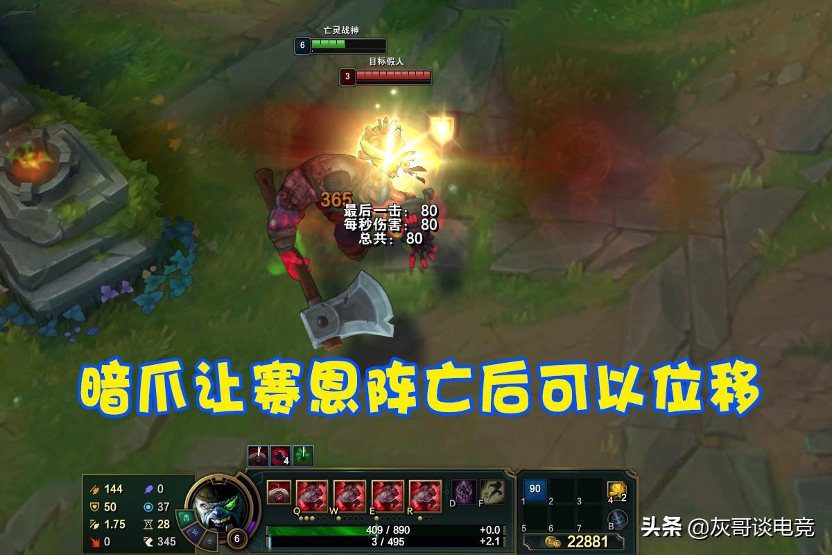 另外灰哥还有一个小技巧要教给大家,赛恩阵亡后的尸体是无法使用任何召唤师技能的,但只要你在尸体状态下使用金身,金身时间结束后召唤师技能就可以使用了,恰好赛恩的WE都有AP加成,中娅的性价比也比一般肉装要更高,第四件或者第五件补是完全可行的,这样尸体在团战中就又多了一段位移,更有机会接近C位。