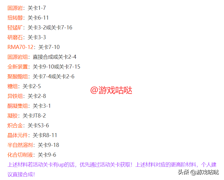 固源岩组:推荐关卡2-4!关卡2-4单件掉落的期望理智为28.34(差不多每3盘掉落1个)。不过,5个固源岩可直接合成1个固源岩组,等价于24.1理智。因此,玩家也可以考虑直接合成!