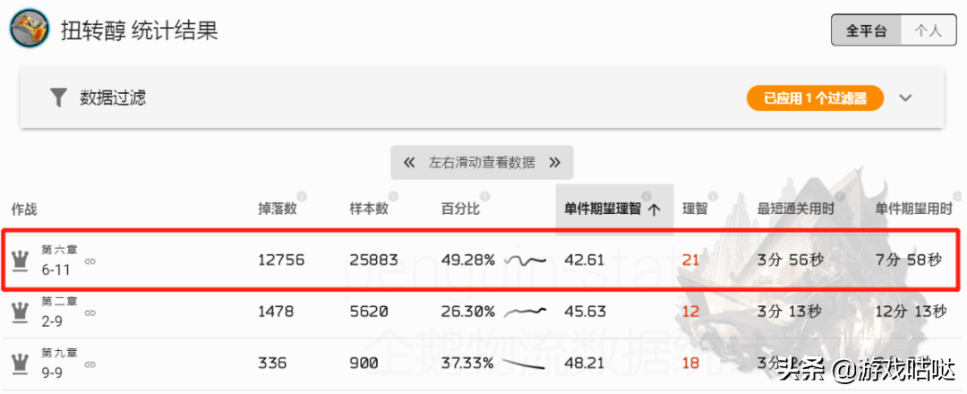 扭转醇:推荐关卡6-11!其单件掉落的期望理智为42.61(差不多每2盘掉落1个)。