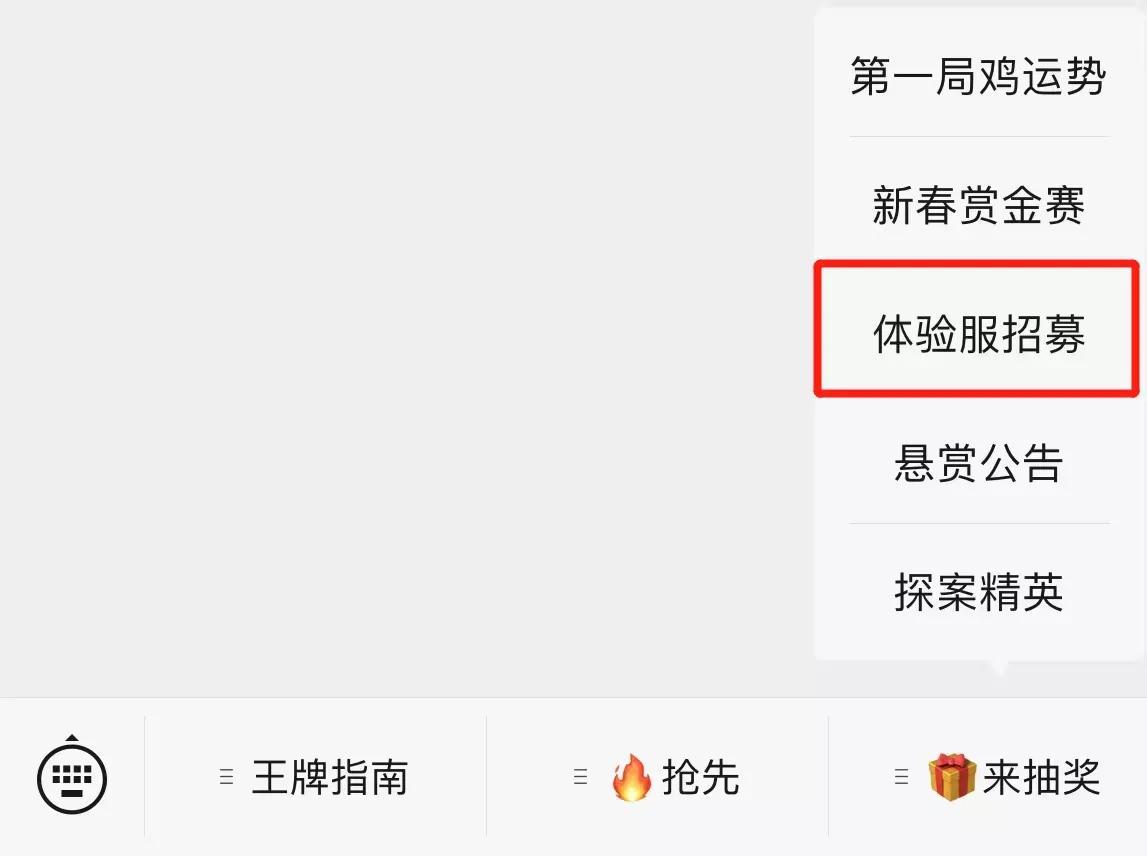 5月30日-6月4日,体验服开启以实际收到短信时间为准。二、参与策略提醒和平精英公众号通过以下策略填写调查问卷(1)点击菜单栏→“体验服招募”→参与问卷调研;