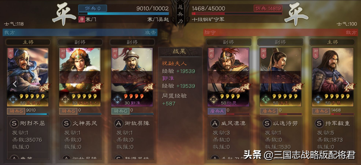 总体评价:当然了,这个队伍虽然看起来不错,可是当夏侯惇打到第二队的时候,由于失去了大量的减伤战法,加上兵力也只剩下9000了,打起来还是相当有难度的,除非鲁莽无限奶才可能拥有比较大的赢面,不过能打出这样的效果也已经非常不错了。