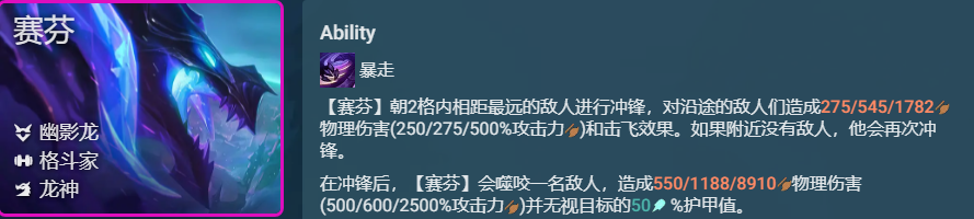 赛芬技能是有两段,第一段是进行冲锋,会造成控制加物理伤害,冲锋操作中不会被控制打断,如果撞空会继续冲撞下一个目标。第二段是在冲锋后会有一个巨额的单体伤害,基本上在中期A到谁就秒谁。