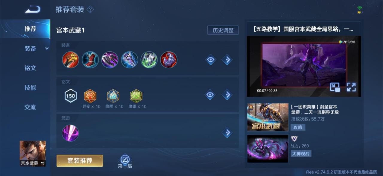 解析:新宫本武藏的CD非常短,可以频繁触发冰痕之握的被动,而宫本武藏又比较脆弱,技能又是切入型,所以建议半肉出装。如果是想玩玩新战术,可以开发暴击吸血流,宫本的被动是可以暴击吸血的。