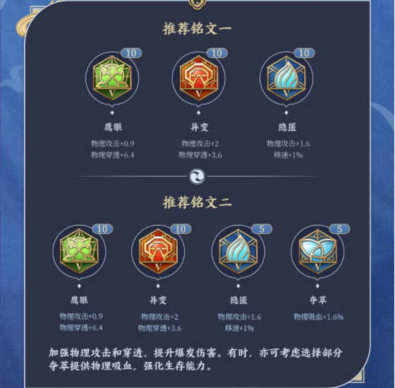 解析:新宫本武藏技能Ad加成不是特别高,百穿铭文搭配暗影战斧提升伤害比较明显,这也是大多数物理战士的通用铭文。同时也可以加入适量的吸血铭文,宫本被动的强化普攻可以吸血。
