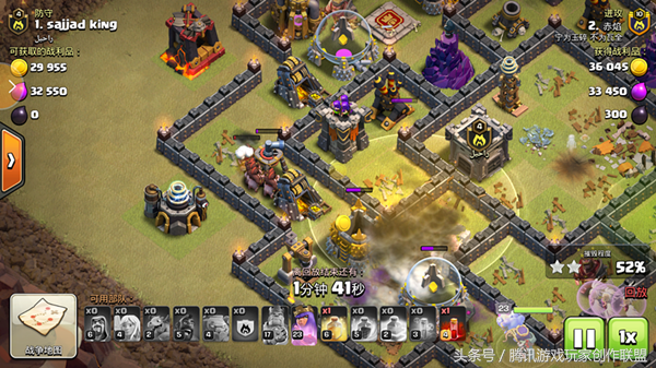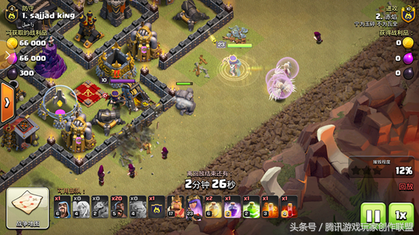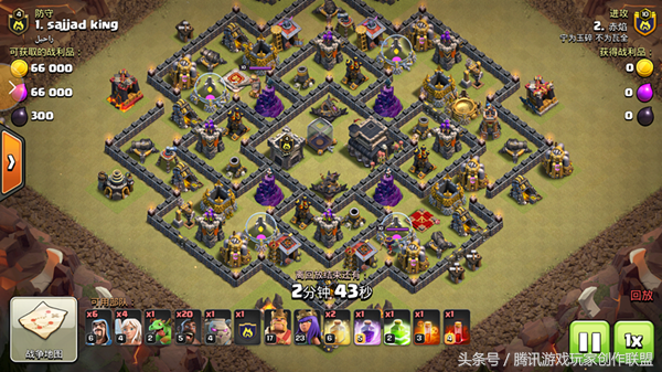 放下女王后可以选择配合飞龙宝宝来矫正女王的走位,也可以使用法师,这里试阵型情况。在女王进去预定的滑行路线后,点下石头人,用法师清理外围的建筑,这里细心一点不要急。在清边工作结束后扔下弹跳药水建议石头人进去阵心,点下剩余的法师,蛮王和援兵的巨石投手。在推进的操作中可以提前扔下狂暴药水,触发了敌方援兵后先扔下毒药降低敌方援兵的状态,在狂暴状态的女王法师等输出部队就可行秒杀援兵了。