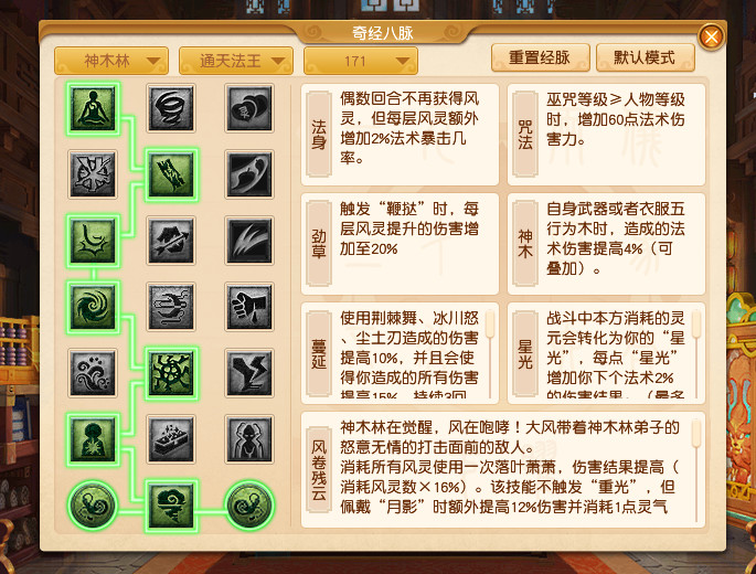推荐经脉选择路线:法身-咒法-劲草-神木-蔓延-星光-风卷残云。