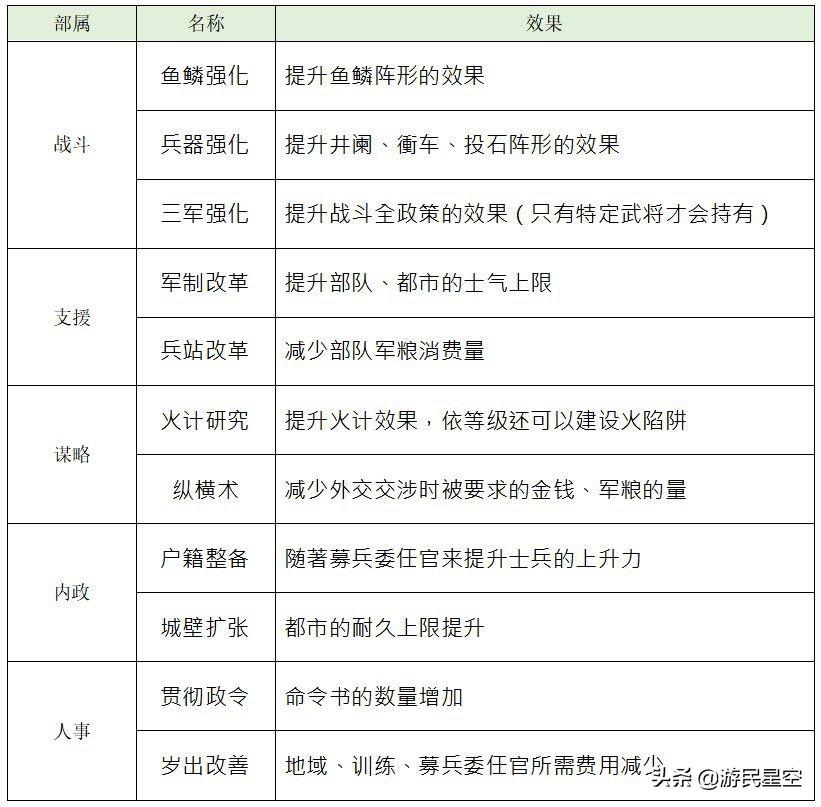 武将的政策当中有提升鱼鳞阵形效果的鱼鳞强化、提升部队及都市士气上限的军制改革、可以建设火陷阱的火计研究等,组织这些充满个性的政策,建构有效的施政将可为战略带来极大影响力。此外,还有仅有少数武将才会持有的强力政策存在,例如可匹敌战斗部属的全政策效果的三军强化等。