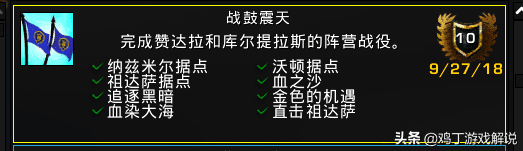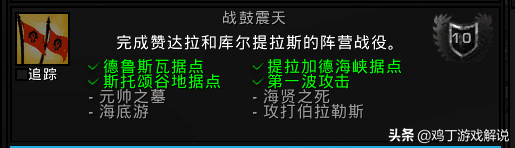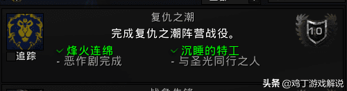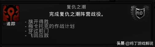 这个复仇之潮成就就是阵营战役,在任务书最上层有个特别的地方显示的。复仇之潮需要先完成前置战役,即取得“战鼓震天“成就,蛮绕的。总之就是,阵营战役全部完成,就能解锁8.15新出的种族,这个是要件之一啦。