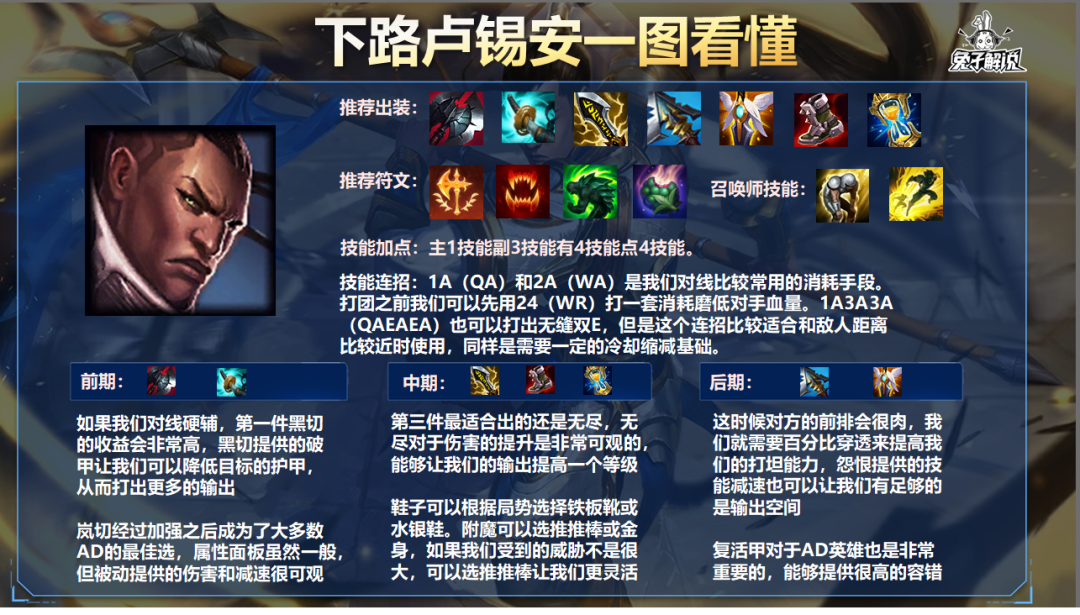 大家好,我是兔子攻略组的大马猴。今天给大家推荐一下卢锡安的最佳出装,基本上是在之前出装上面进行了一次升级,当然了这都是根据版本来选择的。即便是当前版本的环境,卢锡安也是一个非常强势的AD,因为他前期也可以短时间打出很高的伤害,其他AD的输出在前期则比较缓慢,这也是为什么卢锡安在大多数版本都非常强的原因之一。