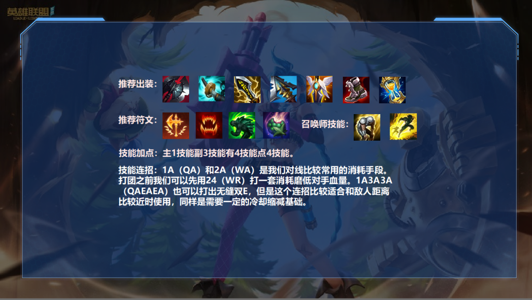 1A(QA)和2A(WA)是我们对线比较常用的消耗策略。打团之前我们可以先用24(WR)打一套消耗磨低对手血量。1A3A3A(QAEAEA)也可以打出无缝双E,但是这个连招比较适合和敌人距离比较近时使用,同样是需要一定的冷却缩减基础。