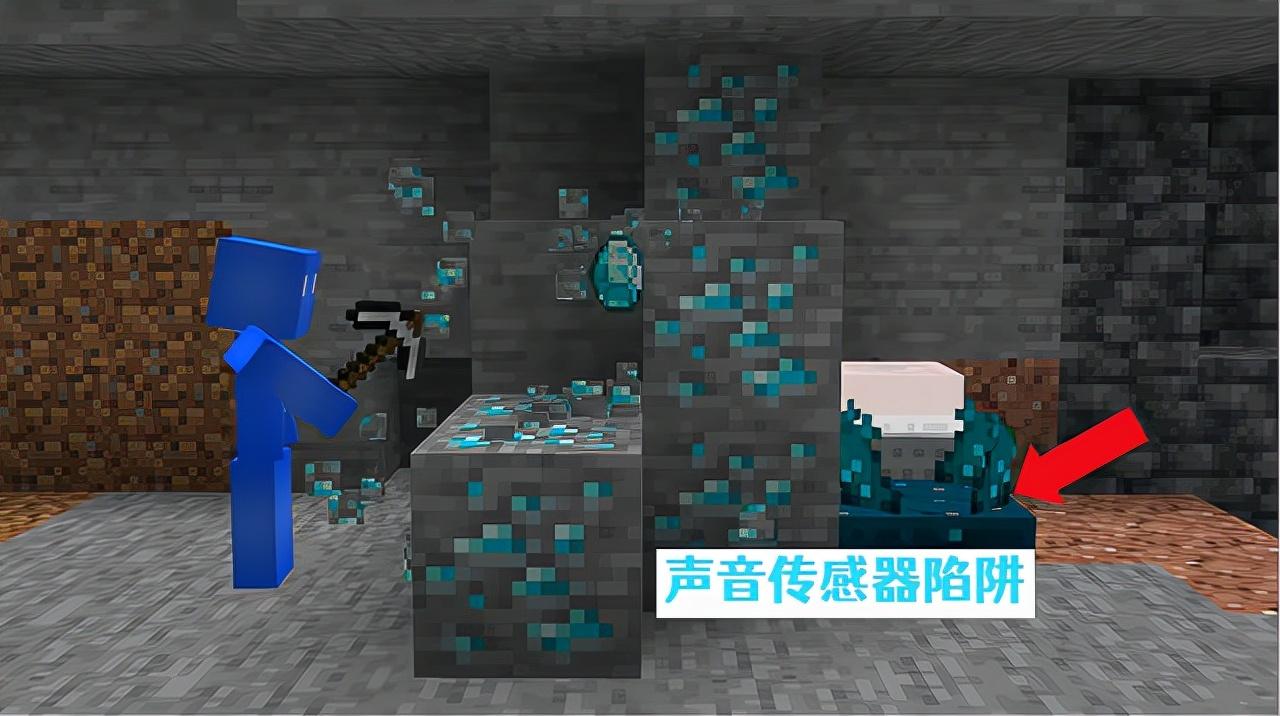 所以利用挖矿的是因,搭配“潜声传感器”就是一个完美的陷阱,在钻石下方或者后方布置好陷阱,相信没有玩家会拒绝钻石的诱惑,而不去挖它们的。