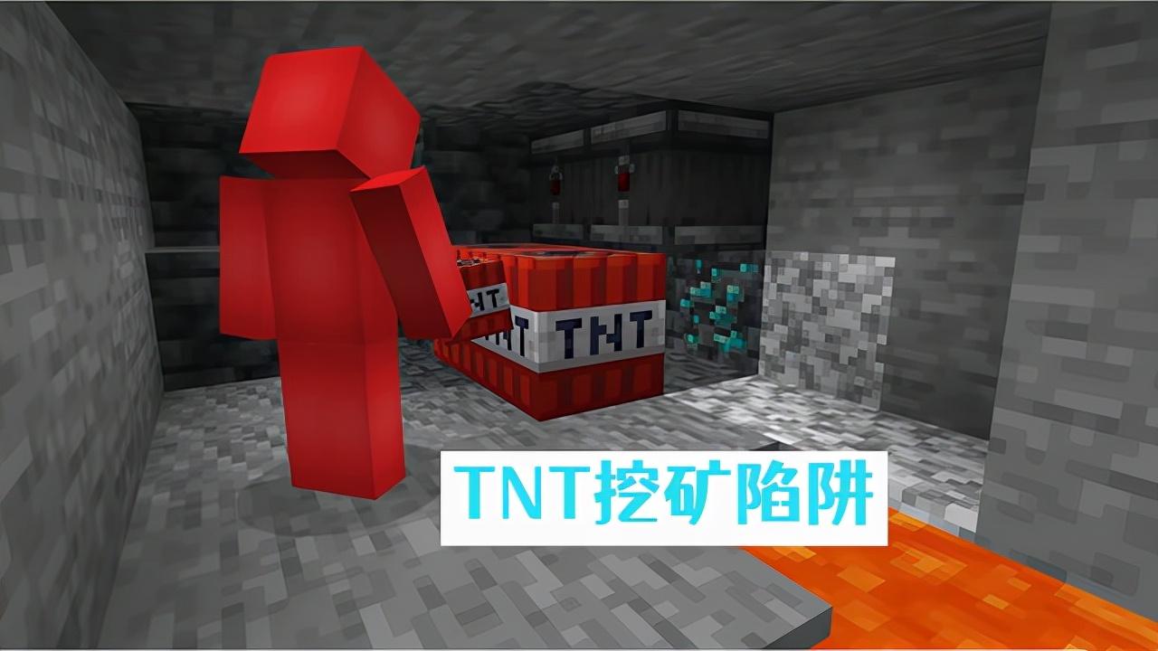 一个类似于“潜声传感器”的陷阱,利用“侦测器”来检测前方方块状态,当钻石矿石被玩家挖掉以后,侦测器会激活后方的TNT方块,缺点就是机智的老mc,可能看到侦测器或者听到TNT被引燃的声音,会第一时间选择跑开。