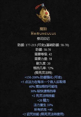 盾牌选用魔胎,+2技能、高格挡、高抗性、法力恢复等属性都不错,如果没有的话可以用符文之语精神盾(7#+10#+9#+11#)先代替。