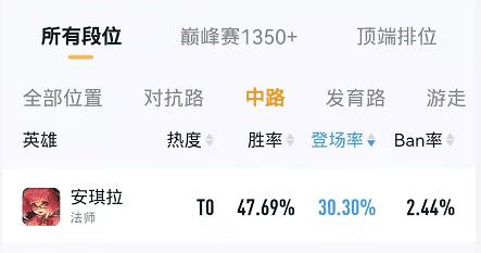 安琪拉是一名中路发是,当前的热度是T0,胜率并不高,但是在所有段位排名中,她是位居首位,同时ban率并没有很高,仅为2.23%。