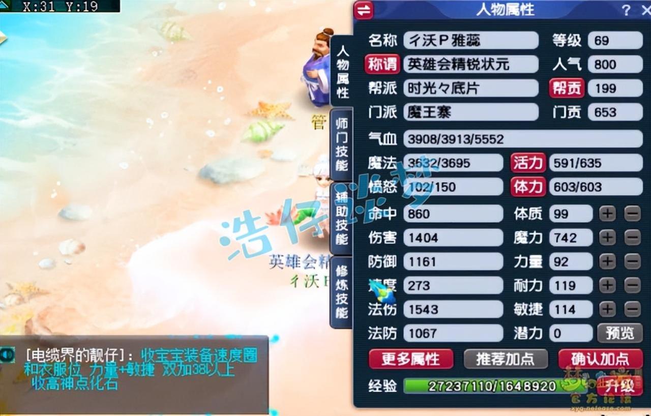 69级魔王打符之后的面板属性,其实他做的是守尸魔王,但是这个是打了速度符的面板属性,如果不打速度符,速度只有150多点,还是比较慢的。