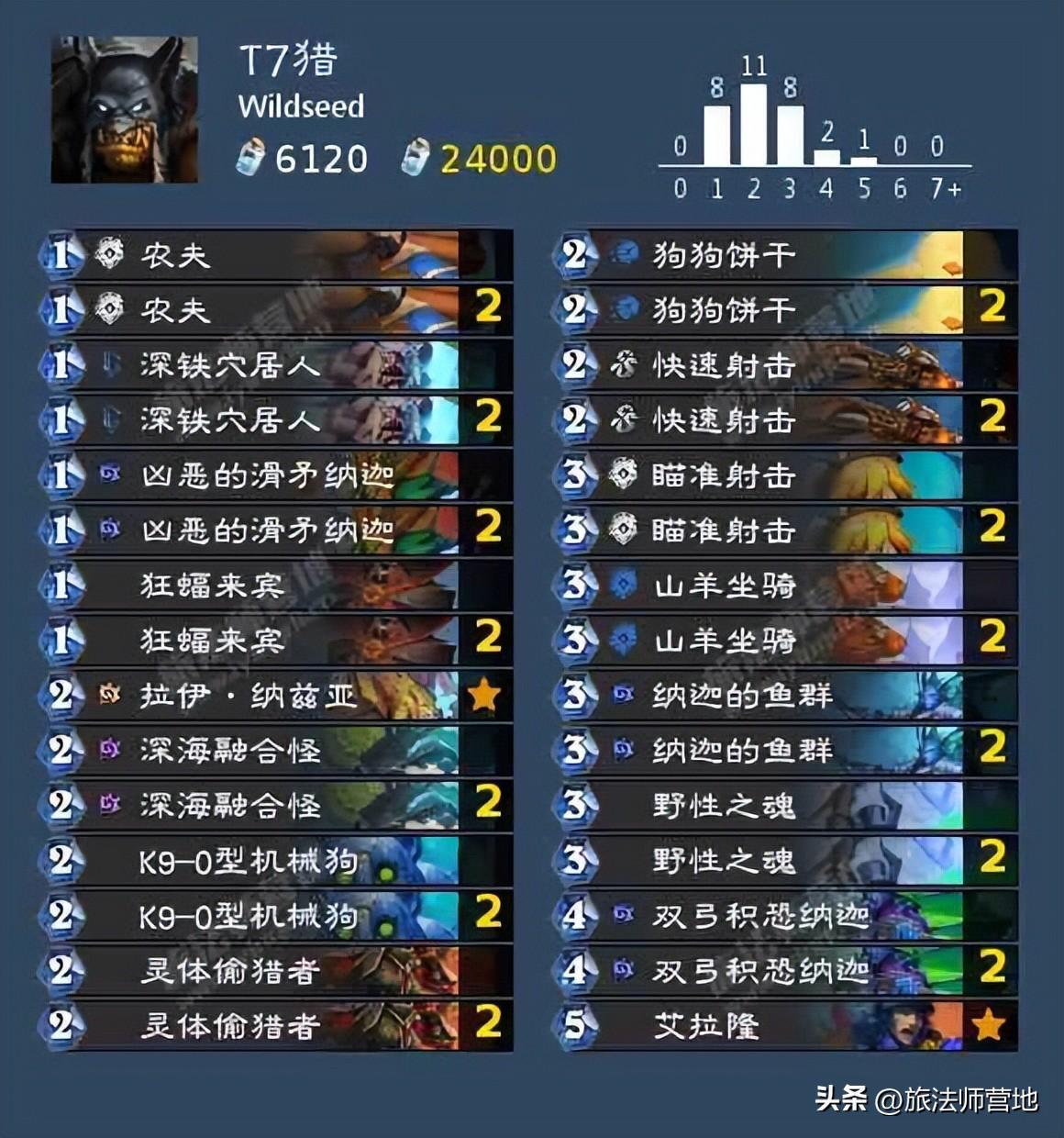 卡组的构筑亮点是带上了凶恶的滑矛纳迦+加深海融合怪+纳迦的鱼群的combo,来增强前期的站场能力,T7猎主要的抢血就是靠前期的场面抢下的,配合狗狗饼干和山羊坐骑抢血。野性之魂虽然灵种被削弱了,但还是猎人三费曲线上最好的站场选择,后期主要是靠拉伊配合直伤法术斩杀,双弓积恐纳迦配合直伤斩杀。