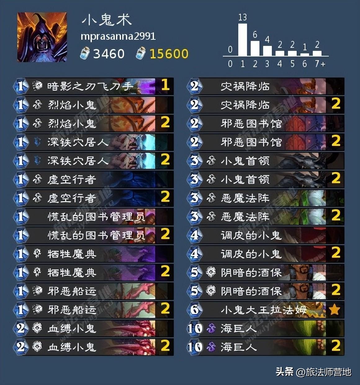 动物园思路的小鬼术,亮点是满编了两个海巨人,可以配合前期的小鬼牌铺场,中期提高场面的爆发力。卡组的核心制胜点是靠灾祸降临过牌补充资源,并用邪恶图书馆和阴暗的酒保膨胀场面。