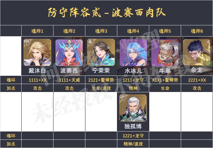 波赛西的练度一定要高,最好其攻击力可以稳定的高于对方的先手辅助和控制系魂师,这样才能保证波赛西的1-1技能能在对方行动前进行释放,且有不低的概率【沉默】对方,一旦对方被波赛西【沉默】那么其先手的优势便会变得岌岌可危,外加我方宁荣荣、水冰儿和佘龙的3重行动条规定,这个队伍可以为沐白的输出提供极为舒服的输出环境,另外波赛西的主动回合直接向对方的核心状态施加魂师使用4-1技能,对方行动一次后其所施加的状态则会全部消失,例如给对方的老犀牛用一下,则开局的【定军】在犀牛行动一次后即会全部消失;如果给独孤博用一下,他所施加的【中毒】效果也会全部消失,所以利用这点我们可以轻松的破掉对方的核心防御技能,为戴沐白和佘龙的输出提供极为便利的环境此阵容的其他属性同刚刚讲过的防守阵容壹